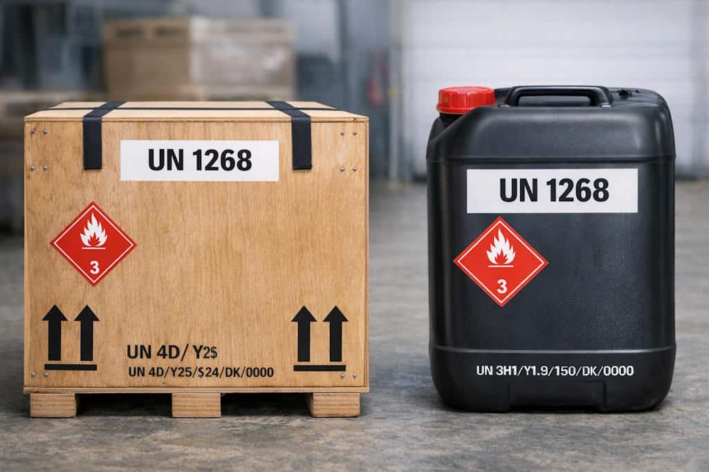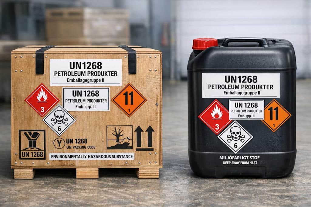 Opfølgende tale-prompt: ” det er jo helt forkert – den rigtige udformning er følgende: Teksten “UN 1268” i min 12 mm høje bogstaver (forholdsmæssigt til billedet størrelse) Fareseddel 3 (størrelse 10×10 cm med spidsen pegende nedaf) Retningspile på to modstående sider på kombinationsemballager UN typegodkendelse på begge kolli (bogstaverne “UN” i en cirkel efterfulgt af typegodkendelsen som i kapitel 6.1). Kan du gøre et nyt forsøg, tak!”