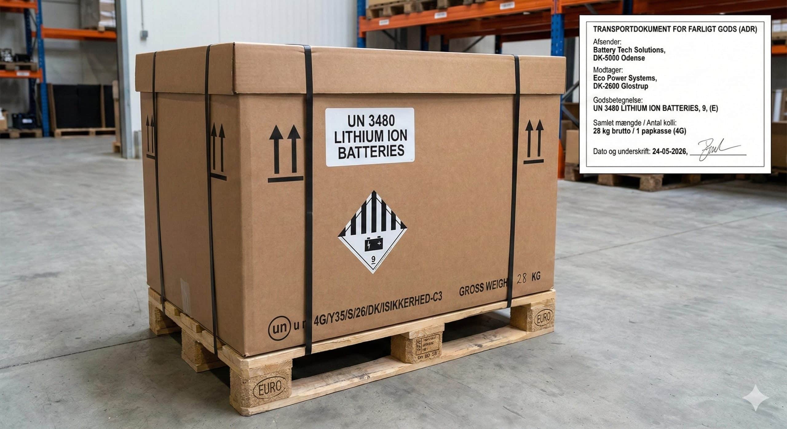 Tale-Prompt: ”Kan du lave et tilsvarende billede hvor der nu kun er et kolli Og det skal være et lithium batteri sendt under un 3480. Det er et stort batteri. Det vejer 28 kg og er langt over 100 watt timer. Så du er Du skal Du skal lave billede så Kassen er fuldstændig korrekt i 20 Og i mærkning og poskrifter og så videre og du må faktisk også godt lave et et lille indskudt billede der viser hvordan far hvad hedder det Undskyld transportdokumentet ser ud.”