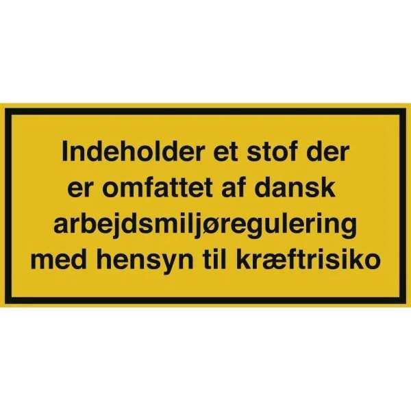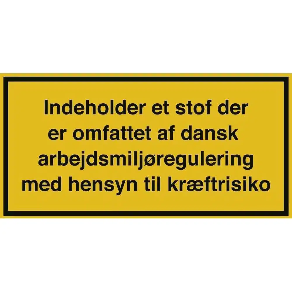 I det omfang, stofferne eller materialerne ikke allerede er mærket med hensyn til kræftrisikoen i henhold til CLP-forordningen om mærkning, skal emballagen på de pågældende stoffer/materialer være forsynet med en etiket med følgende tekst: »Indeholder et stof, der er omfattet af dansk arbejdsmiljøregulering med hensyn til kræftrisiko«.